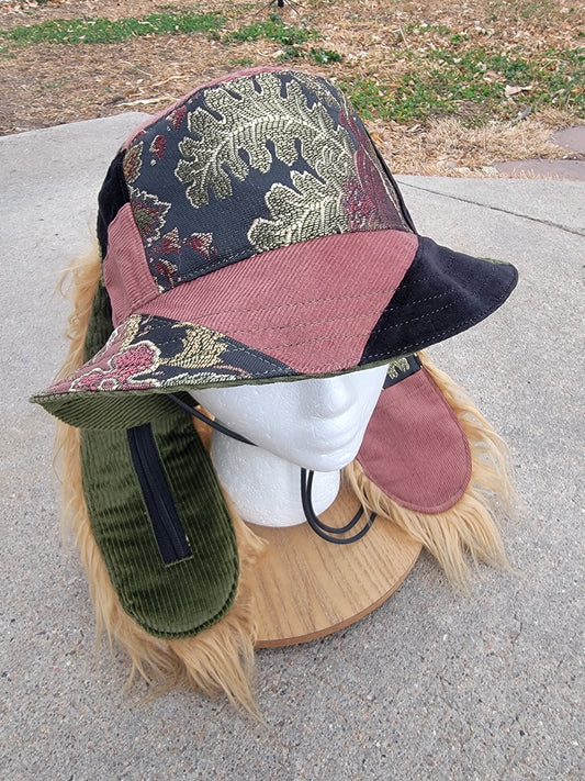 Elevate your festival style with our unique hats, meticulously crafted for sustainability. Each hat is a one-of-a-kind, made from at least 50% upcycled/thrifted fabric. Designed with both fashion and practicality in mind, these hats feature a convenient stash pocket, a secure chinstrap with a cord lock, and button holes for attaching ears of your choice. Bunnies feature their own sewn-in ears, while Boonies offer a longer brim for sun protection.