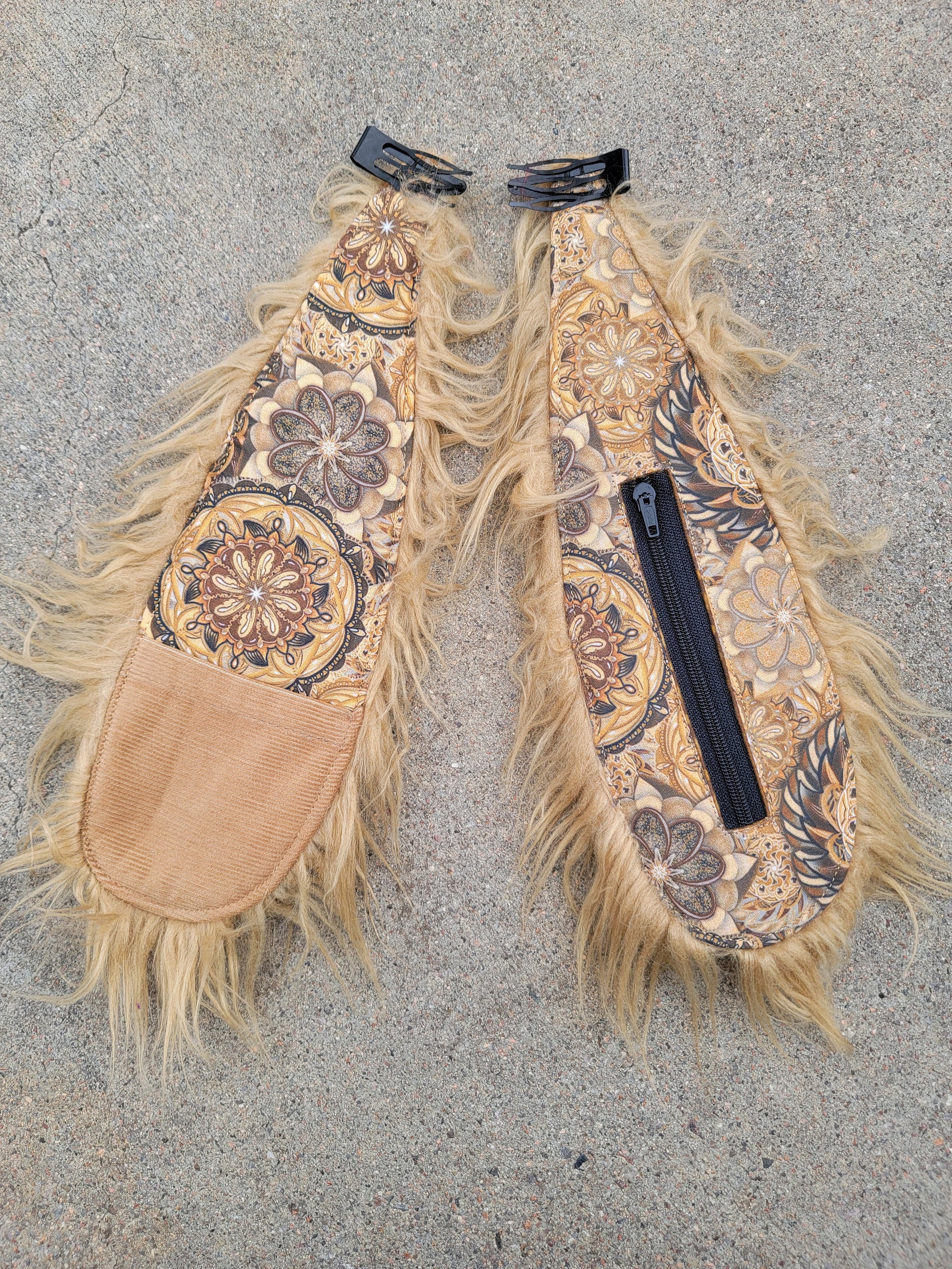 Clip-On Bunny Ears made with long tan faux fur, brown mandala print and a brown corduroy patch pocket. These easy-to-wear ears are hand sewn onto double grip hair clips and are approximately 13'' long. They feature a pocket on each ear, one having a zipper closure for being able to safely stash things away.