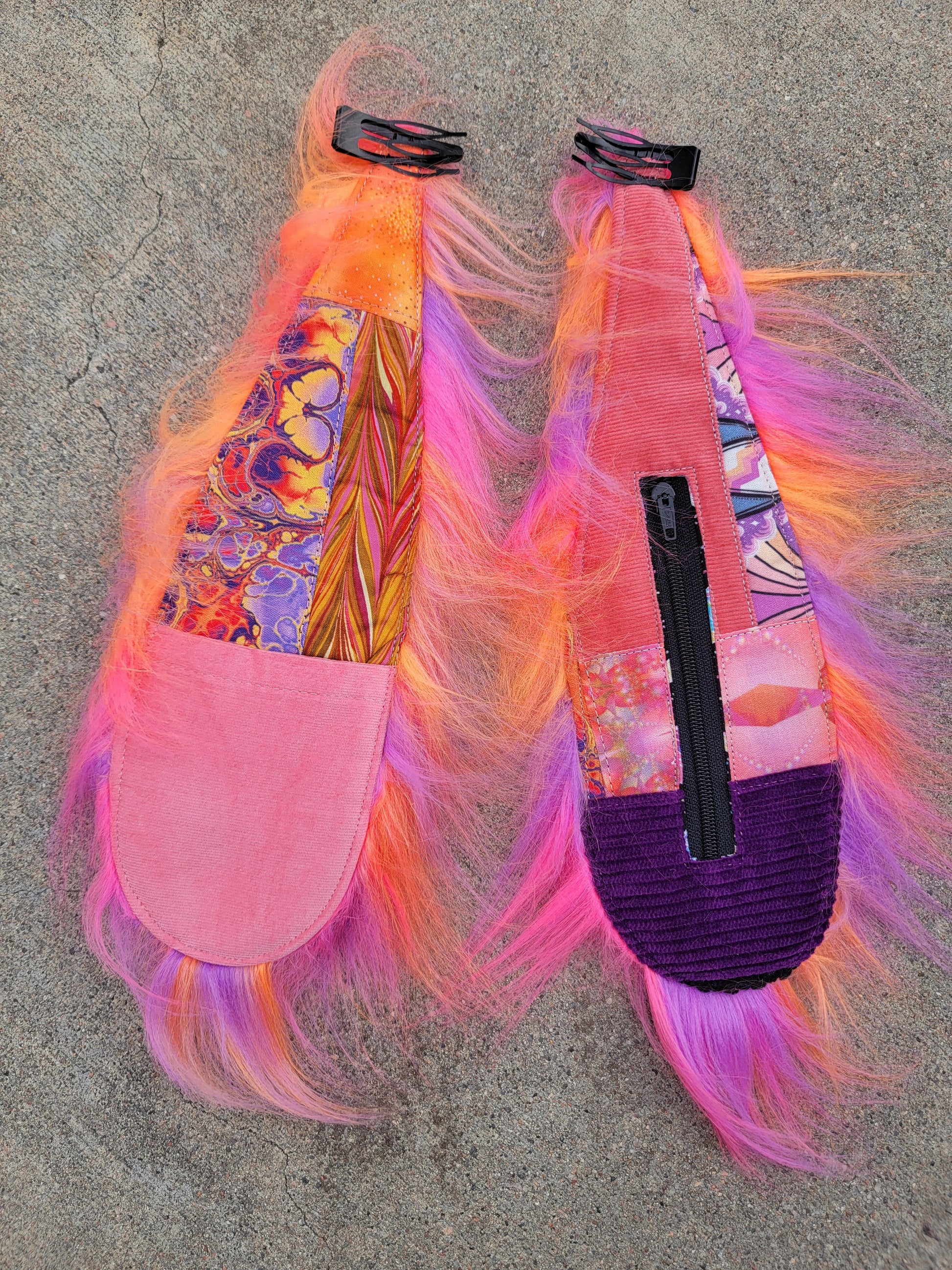 Clip-On Bunny Ears made with long sunset faux fur, sunset fabrics patchworked and a pink corduroy patch pocket. These easy-to-wear ears are hand sewn onto double grip hair clips and are approximately 13'' long. They feature a pocket on each ear, one having a zipper closure for being able to safely stash things away.