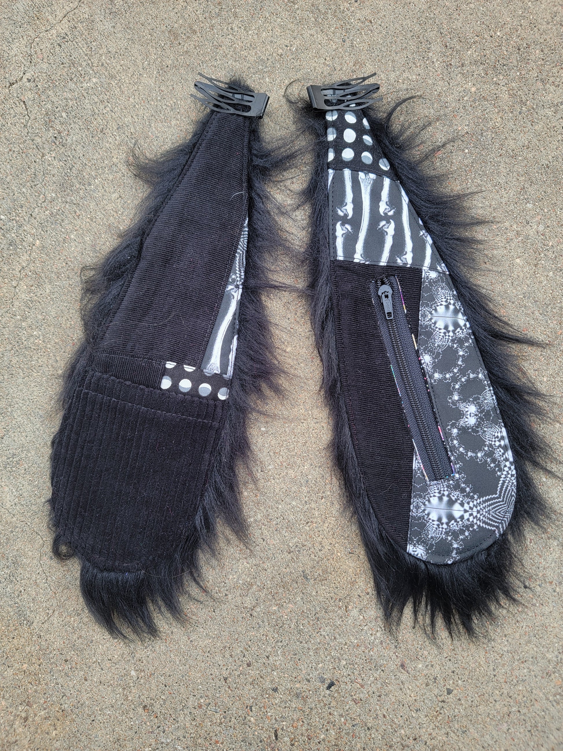 Clip-On Bunny Ears made with long black faux fur, black fabrics patchworked and a black corduroy patch pocket. These easy-to-wear ears are hand sewn onto double grip hair clips and are approximately 13'' long. They feature a pocket on each ear, one having a zipper closure for being able to safely stash things away.