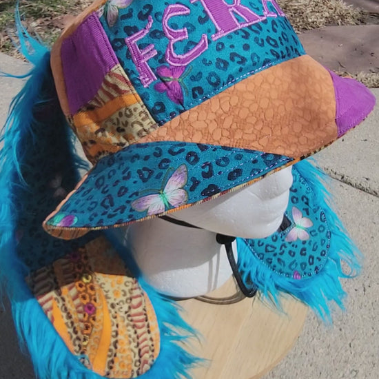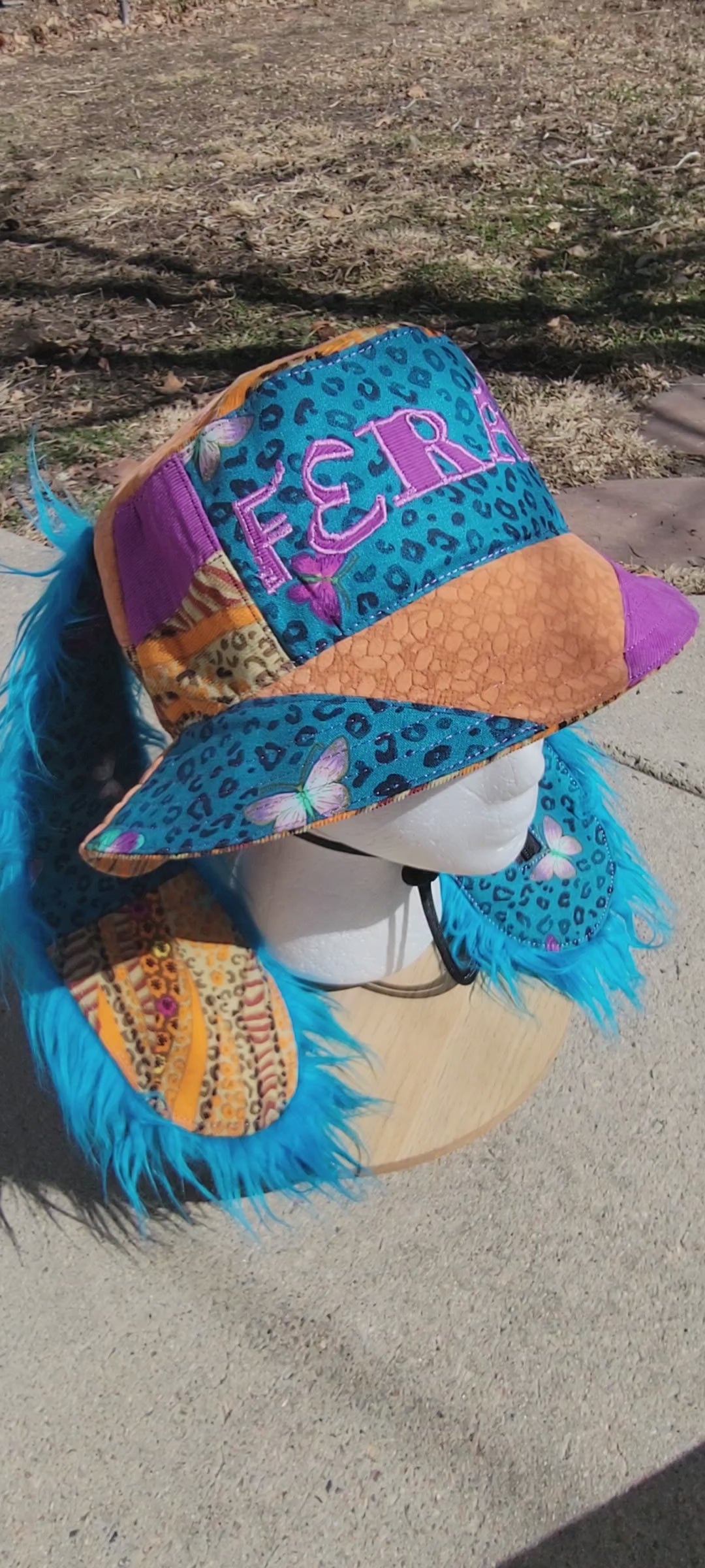 Bunny ears made with blue faux fur & 2 added pockets (1 with zipper)