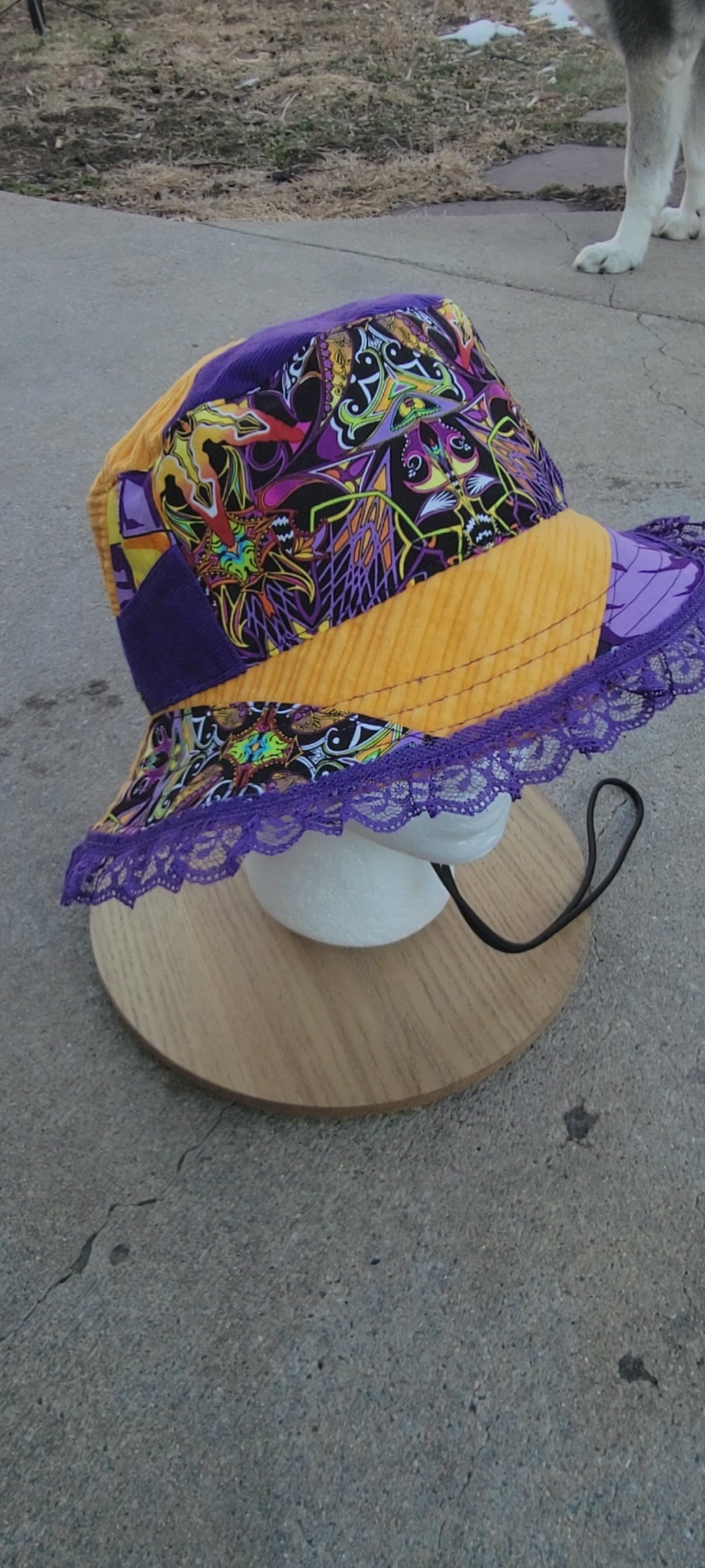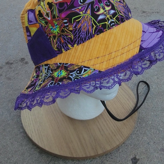 Purple lace trim added to brim